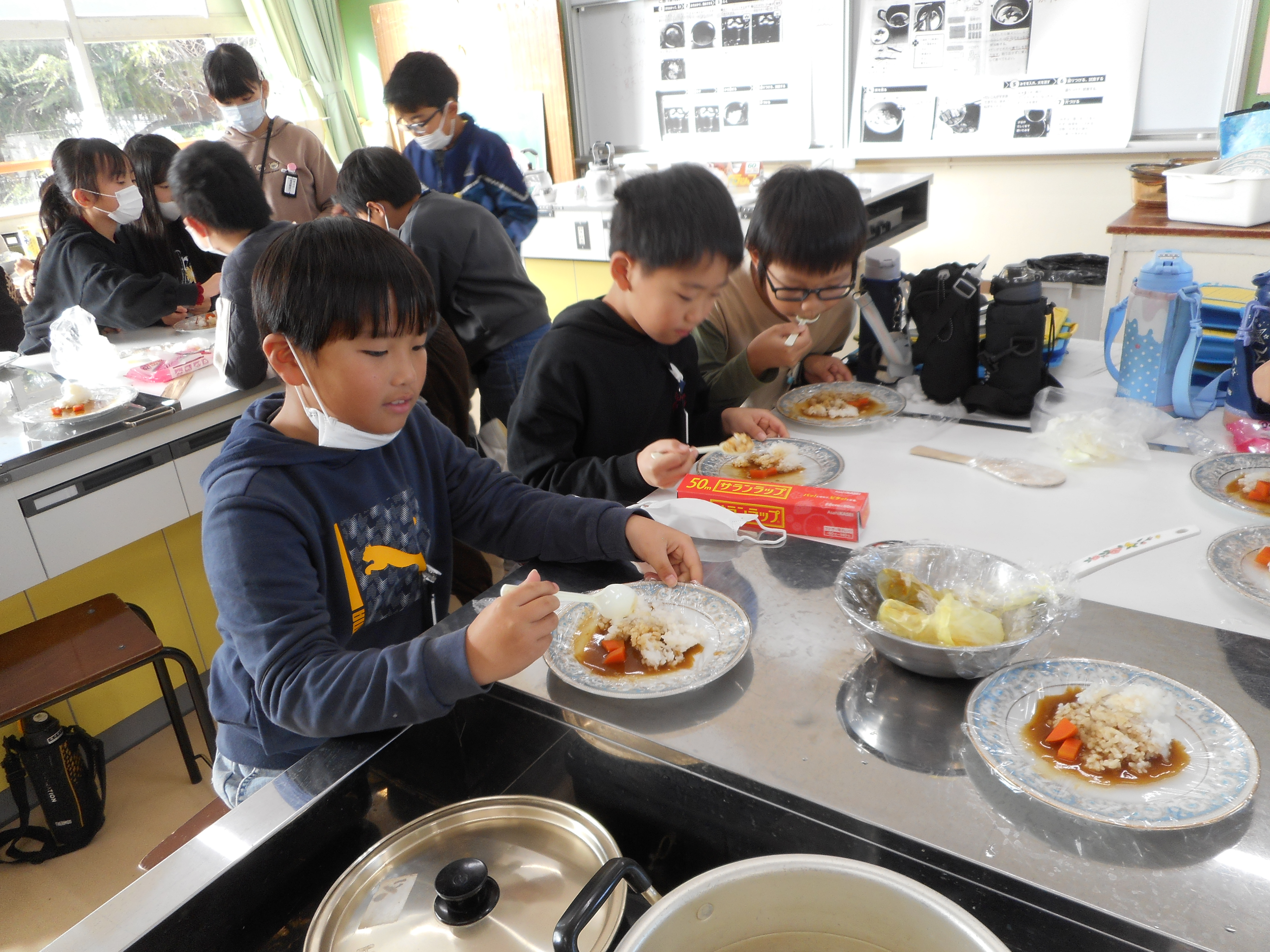 調理を通して、災害時の行動や注意点について理解を深めることができました。少し硬めのご飯でしたが、みんなでおいしくカレーをいただきました。