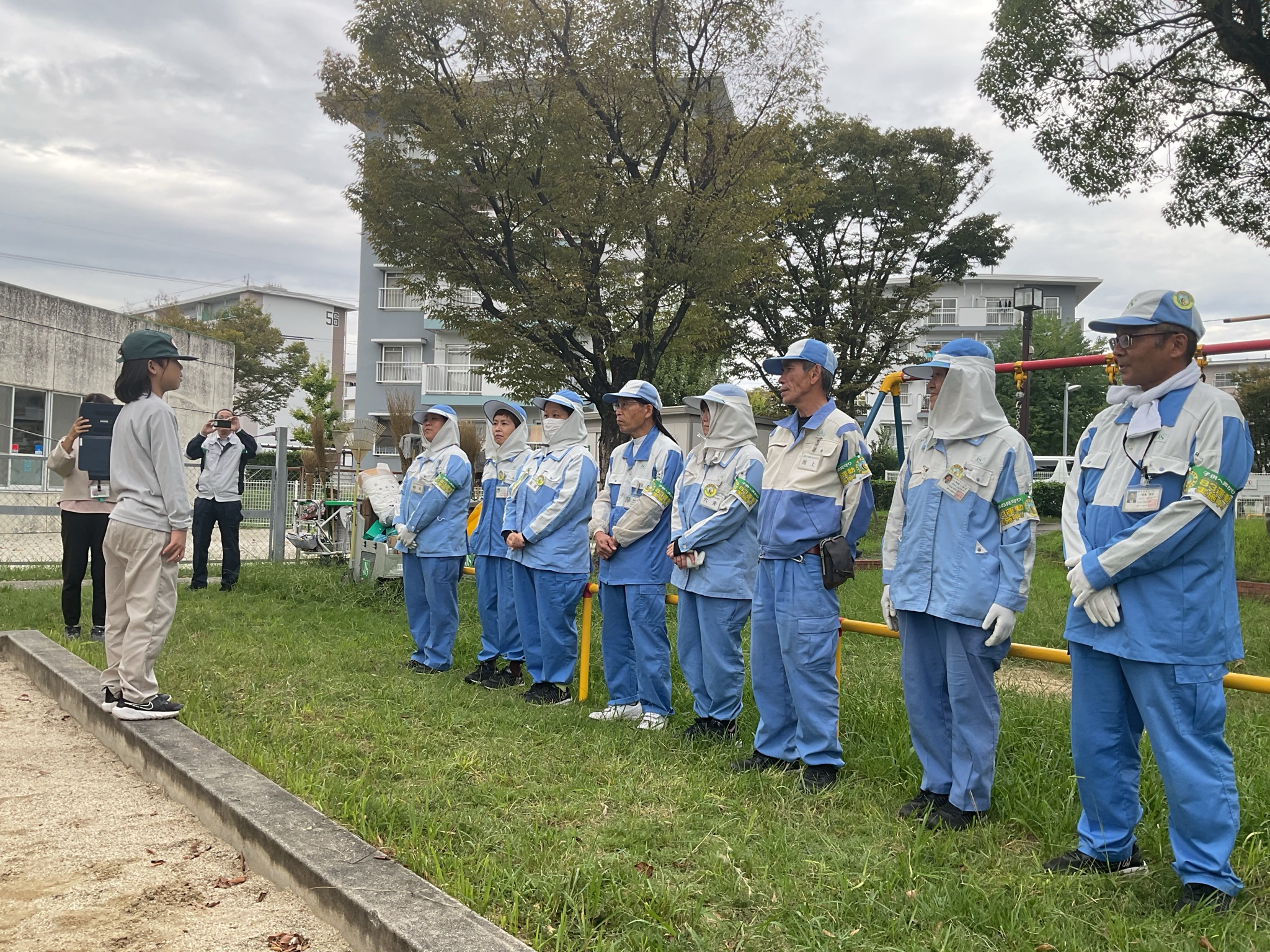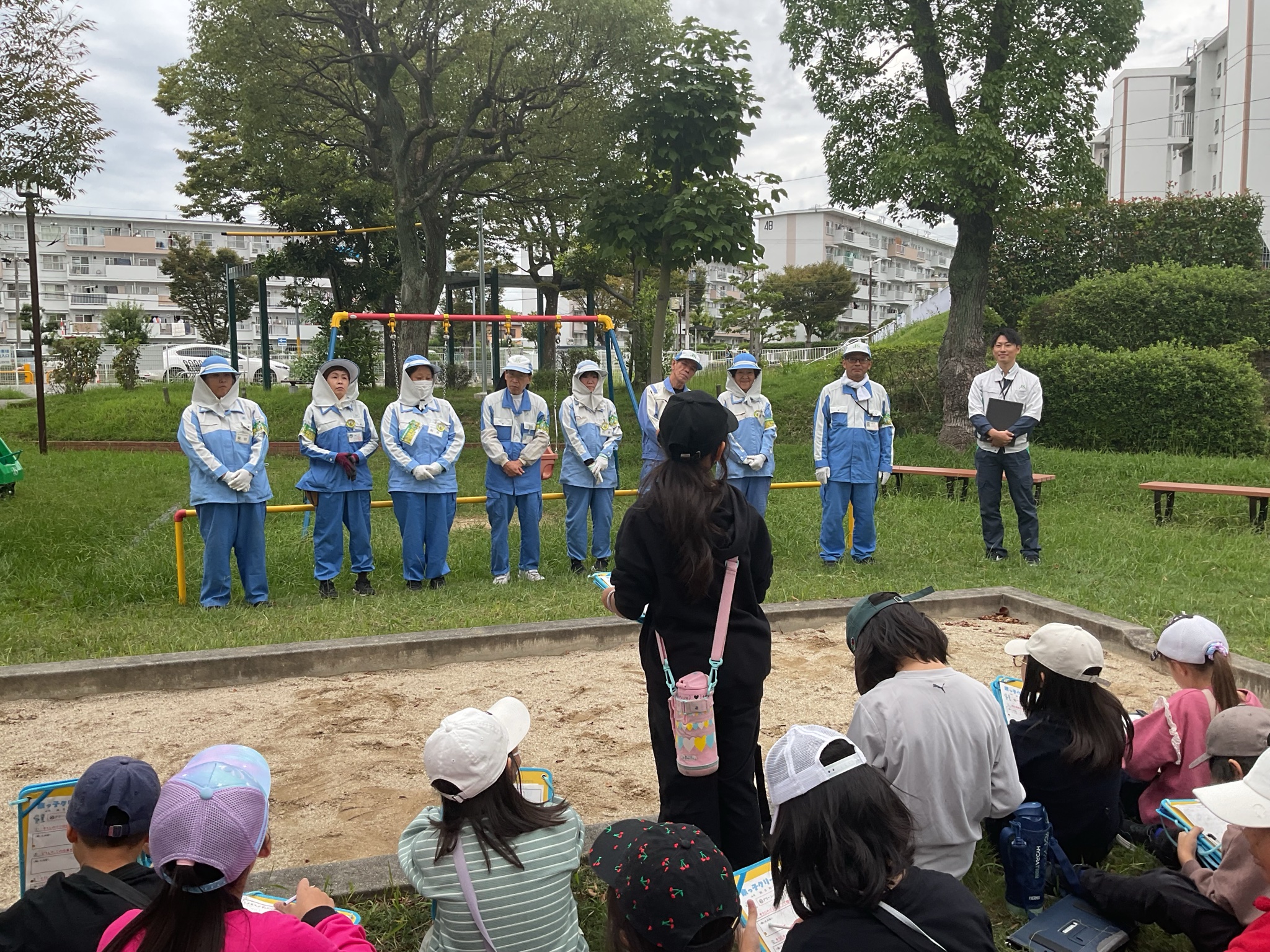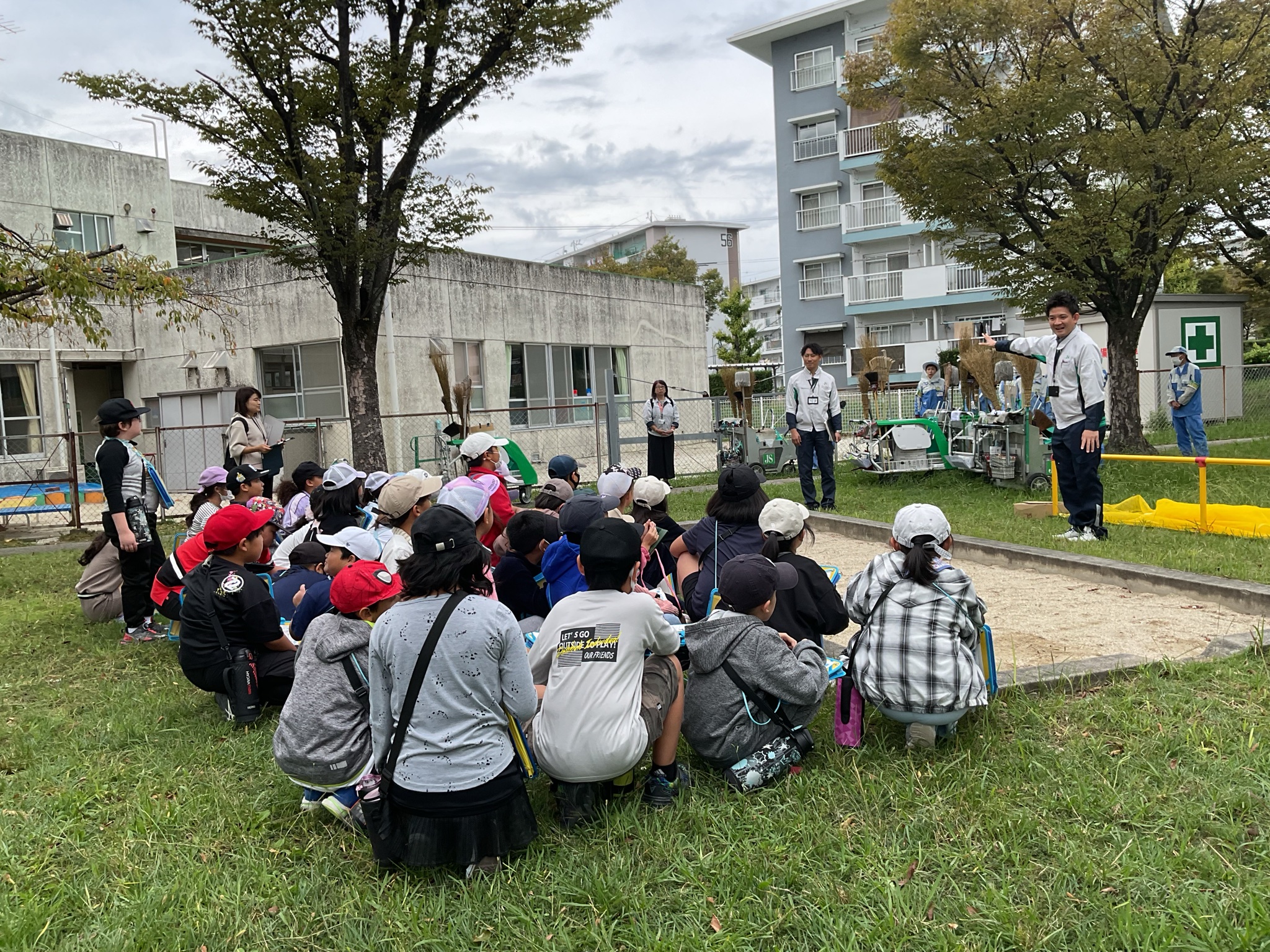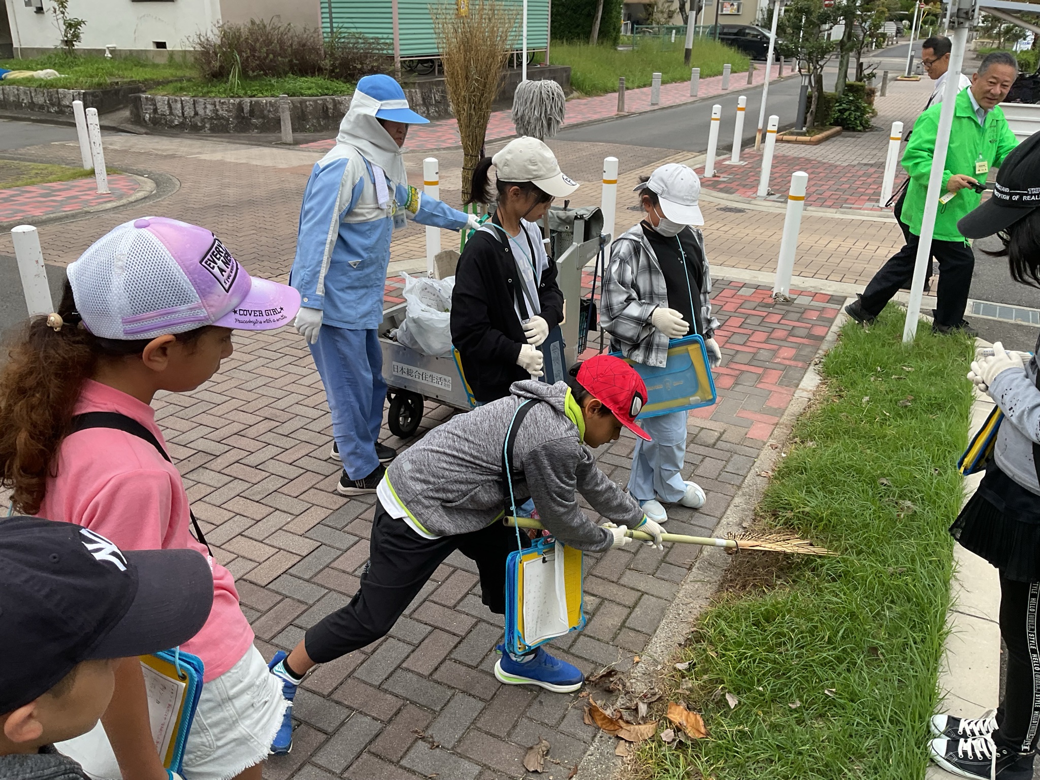4年生 クリーンメイト掃除体験 10月21日(火)、団地内の清掃活動をしている「クリーンメイト」の皆さんと清掃体験学習を行いました。道具の使い方や掃除のコツを教えていただき、子どもたちは真剣に話を聞いていました。後半は一緒に団地の清掃を行い、学びを活かして積極的に取り組む姿が見られました。地域への関心を深める、貴重な時間となりました。