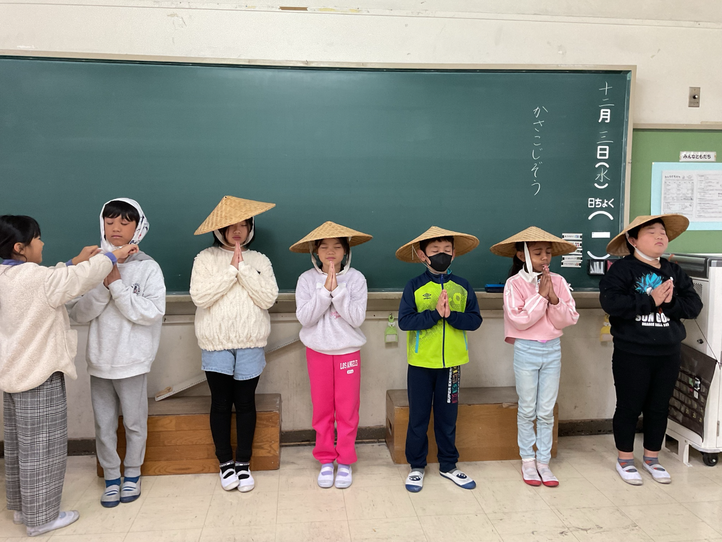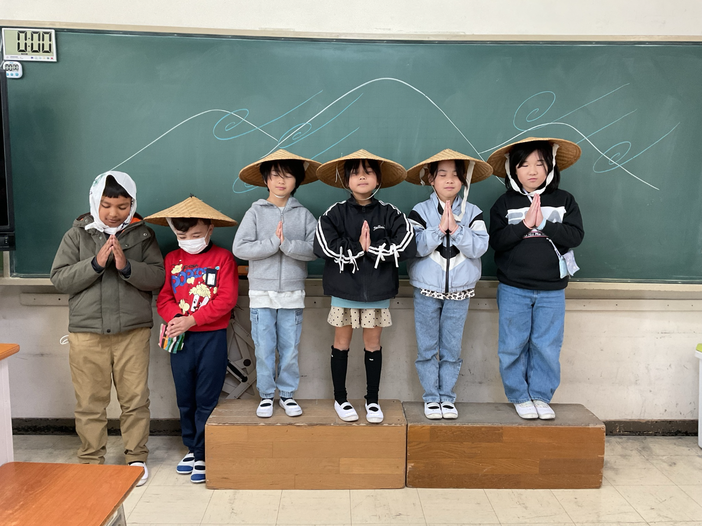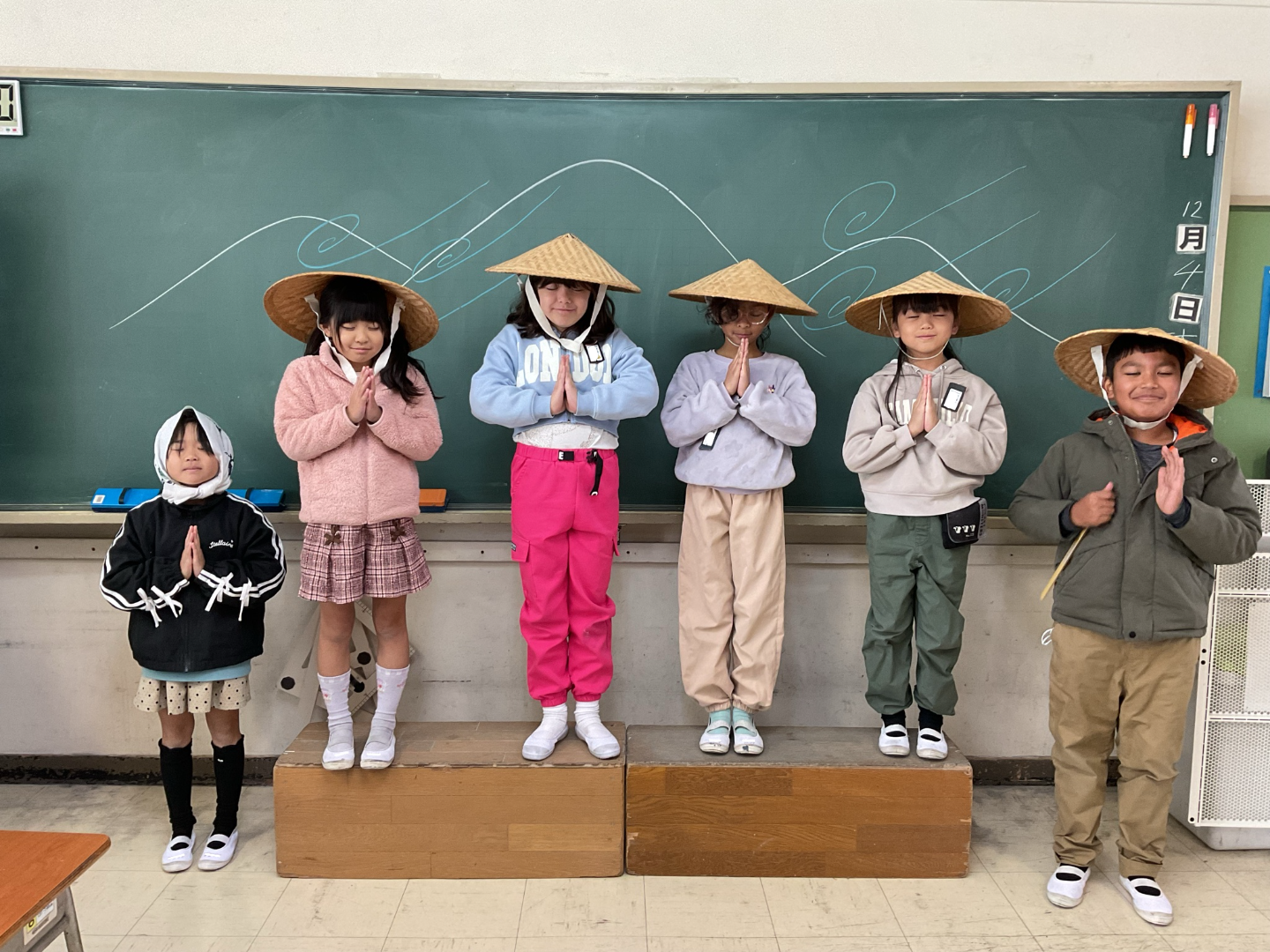 2年生は、国語「かさこじぞう」で、昔話にふれ、そのおもしろさについてを学習しています。じいさまや、じぞうさまになりきって、演じることができました。