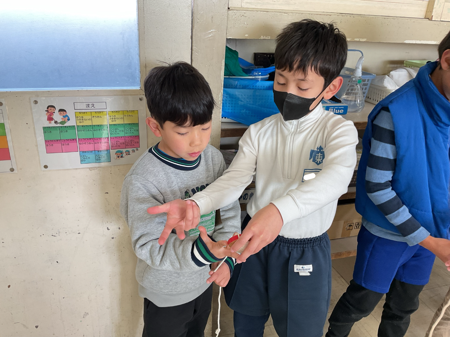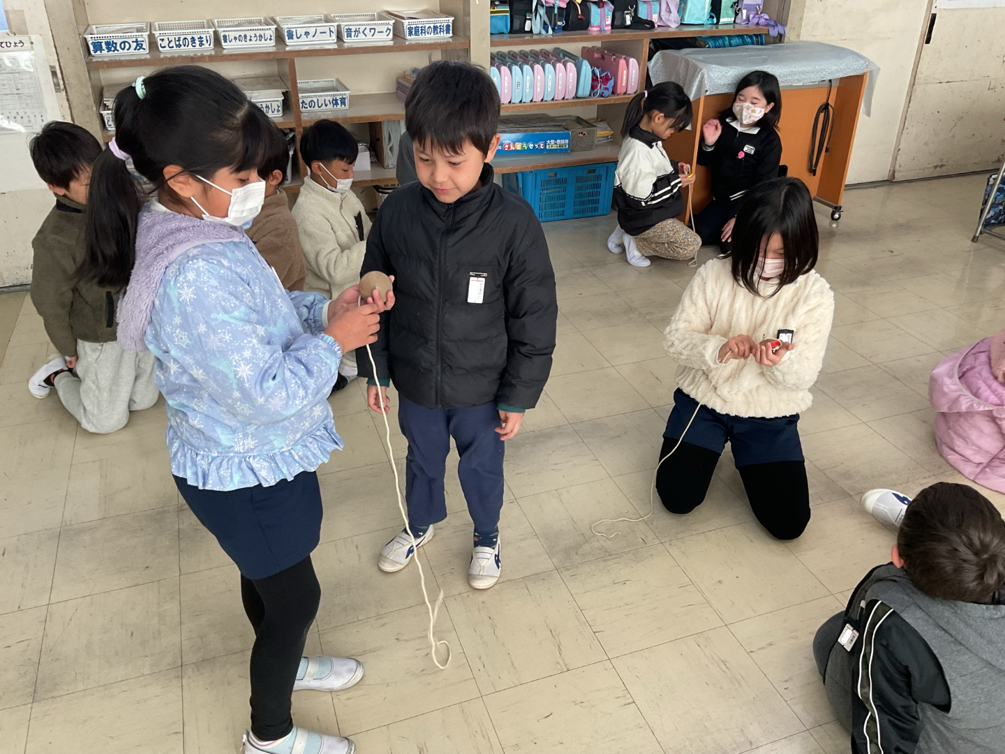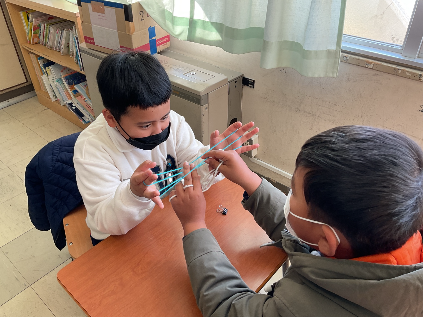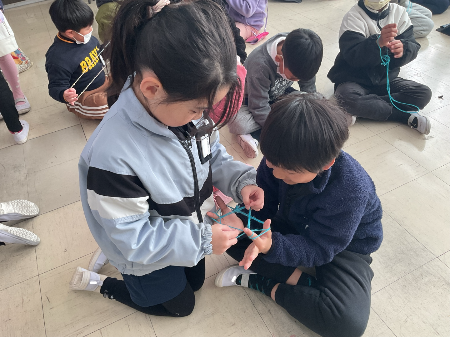 1・2年生 生活科「むかしのあそび」 生活科「むかしのあそび」で、1・2年生合同でこま回しとあやとりをしました。2年生がこまのひもの巻き方や上手く回すこつを教え、1年生は教わりながらこま回しを楽しみました。あやとりは、二人あやとりや星など難しい技にも挑戦しました。