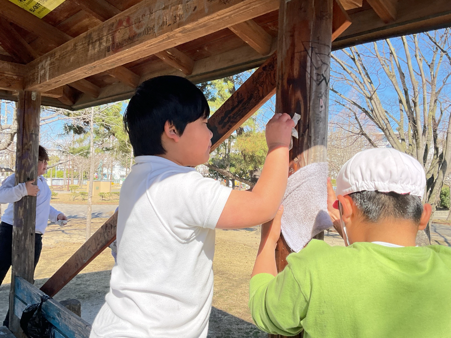 4年生 6号公園掃除体験 4年生が総合学習の授業で、昭和6号公園の清掃活動を行いました。落ち葉やごみを協力して集めたり、ベンチの周りの落書きを丁寧に消したりと、どの子も意欲的に活動する姿が見られました。