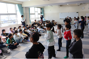 4年生 伝統音楽 6月25日(水)4年生が、日本の伝統音楽の鑑賞・体験を行いました。日本の伝統楽器である琵琶・三味線・笛・太鼓など、演奏を聴いたり、実際に楽器に触れたりすることで、楽しみながら日本の伝統音楽を学ぶことができました。