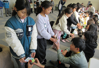 1・2年生 生活科「あそんで作ってくふうして」 2年生は、生活科「あそんで作ってくふうして」で、1年生を招待し、「TOY FES~おもちゃでわっしょい~」を開きました。1年生に楽しんでもらおうと、家庭でいらなくなったものを活用しておもちゃやミニプレゼントを用意しました。子どもたちの笑顔があふれる、よい時間を過ごすことができました。