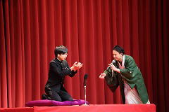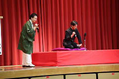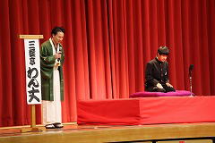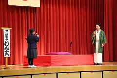 本校を代表して3名の生徒が落語を体験し、緊張しながらも一生懸命頑張りました。