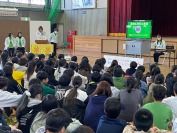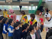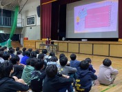 県下一斉で学校安全緊急情報共有化ネットワーク訓練が行われました。訓練の中で1〜3年生は体育館への避難を行いました。その後、全校で防犯教室を行い、「つみきおに」を中心に再確認しました。