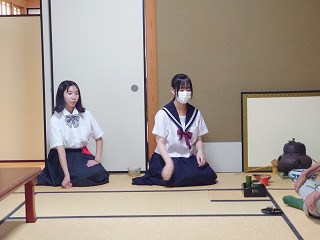 例年はパティオで開催するお茶会ですが、本年は校舎内で開催しました。お茶菓子とお茶を楽しみながら、礼儀作法について学びました。