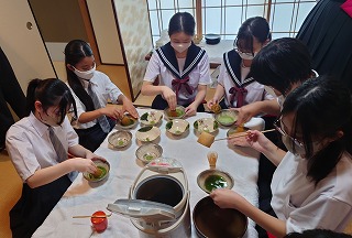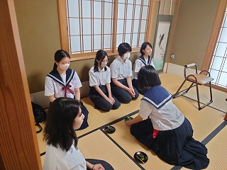 8月8日 パティオ池鯉鮒にて、お茶会が開催されました。生徒達は、自らがたてたお茶を参加者に振舞いました。緊張の中でも、生徒たちは普段部活動の中で意識している「美しい作法」を実践することができていました。
