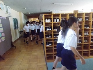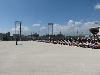 防災の日である9月1日に、避難訓練を行いました。足音だけが聞こえる非日常の雰囲気から生徒たちが真剣に取り組む様子が感じ取れました。最後、教師が「今日、何が起こった日なのか」について尋ねると、半分ぐらいの生徒が手をあげてくれました。生徒たちが生まれる前の出来事ですが、災害を自分事と捉え、もしもの際に備えてほしいと思います。