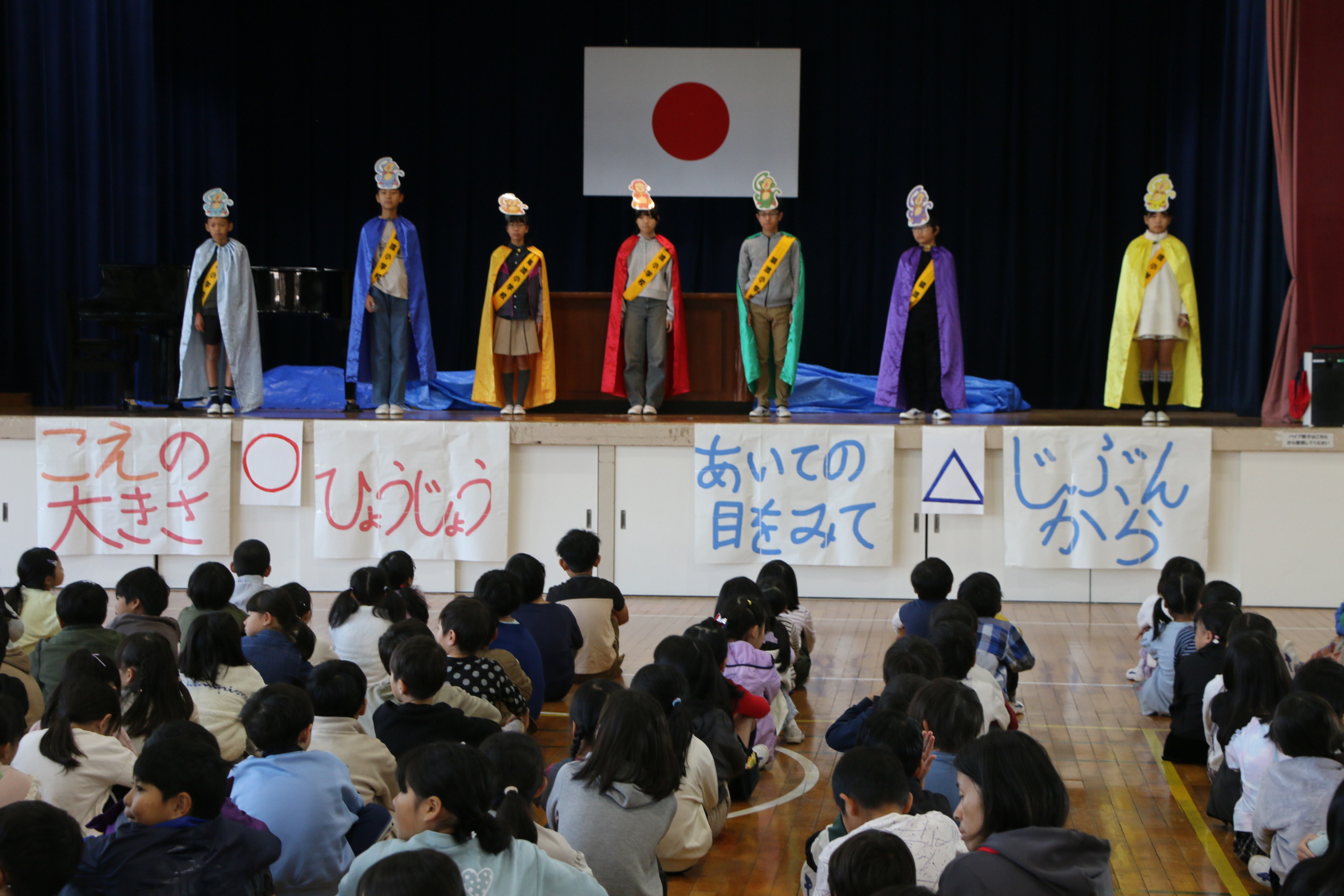 児童集会ではあいさつレンジャーによる「相手の目を見て挨拶をしよう」と